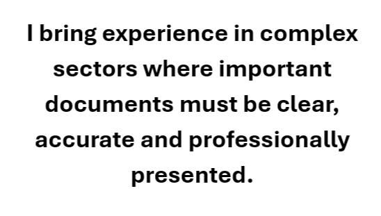 My mission is to help organizations and professionals communicate complex information with clarity, precision, and confidence, offering not just document review, but the expert insight needed to strengthen high-stakes materials and make them truly fit for purpose. Through strategic refinement, careful analysis, and a personalized approach, I work to ensure your documents are clear, credible, and ready for the people who need to read them, use them, approve them, or act on them.With years of experience in the marine and medical sectors, I understand the demands of complex industries and the importance of getting the details right. I take the time to understand your objectives, your audience, and the role each document needs to play. Whether you’re improving procedures, reports, manuals, proposals, or stakeholder-facing materials, I help ensure the final result reflects the professionalism and quality behind your work.