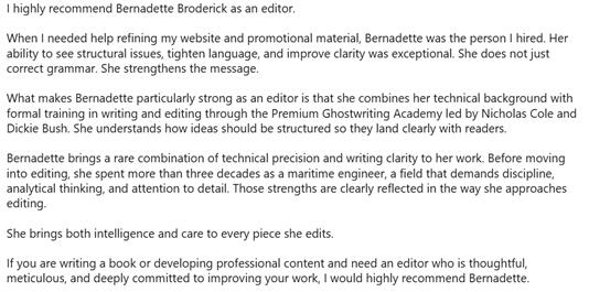 👋 Hello! I'm Bernadette Broderick. I’m a passionate document review and refinement specialist with a knack for improving clarity, structure, and consistency in complex materials and a love for turning important documents into stronger, more effective tools.Over the years, I’ve built a diverse skill set, from technical editing and document review to communication strategy and content development, which allows me to approach challenges both creatively and analytically. I enjoy collaborating with teams to strengthen documents that inform decisions, support operations, and build trust.When I’m not immersed in document work, you’ll find me writing, exploring other creative pursuits, or continuing to learn about strategic communication in specialized industries.